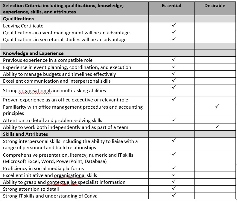 The vision of the Federation is to provide a dynamic and effective voice for Irish Sport promoting the value of sport to Ireland while providing outstanding representation and services to members. The Event and Office Services Executive will seek to inform themselves of the work of the organisation, its aims and objectives and develop an understanding and knowledge of the Federation’s stakeholders and organisational needs.