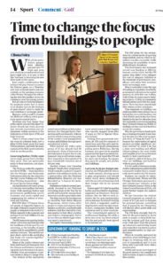 suggested an Employee Exercise Scheme (like the bike-to-work initiative but for gym membership) and an increase in Ireland’s betting levy which, it suggested, could be ring-fenced to create the kind of multi-sport, community facilities that operate so well in other countries.